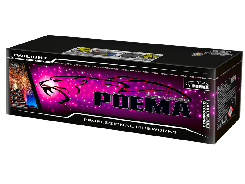 Ein weitere phänomenale Verbundbatterie aus der Poema-Serie. Insgesamt 75 Schüsse. Verkaufseinheit : 1 Stück Effektdauer : 45 Sekunden Schussanzahl : 75 Schuss Kaliber : 25 mm NEM : 942 gr. Nur 1x zünden!