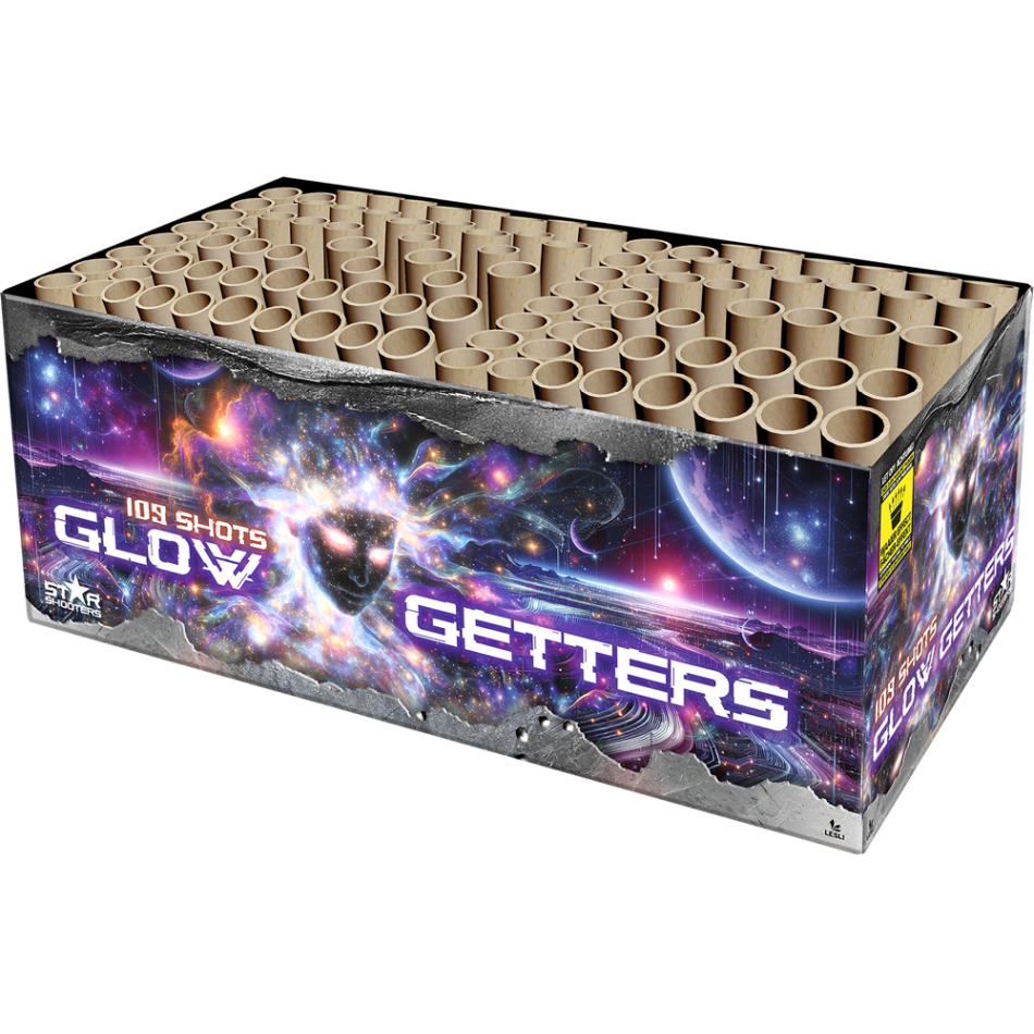 Lass den Himmel mit „Glow Getters“ strahlen! 109 Schuß: bunte Dahlien, goldene Palmen und Meteorschauer beleuchten bis zu 30 Meter Höhe und 80 Meter Breite. Mit „Glow Getters“ bekommt jeder Stern die Chance zu leuchten!