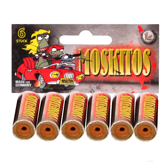 Moskitos, 6er Set Diese agressiven Bienen schießen mit einem Hummer-Sound über Ihr Haus. Verkaufseinheit : 6 Stück Effektdauer : 2 Sekunden Schussanzahl : 6 Schuss Kaliber : xx mm NEM : 2 gr.